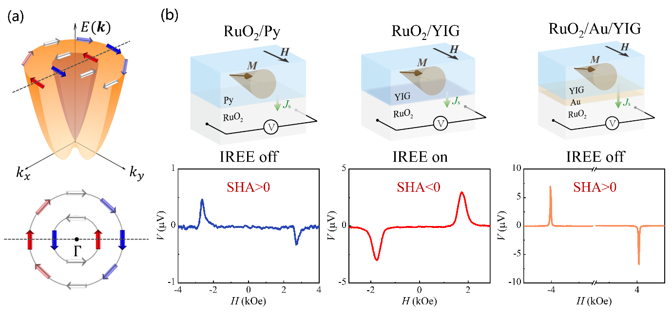 针对这一问题,合作团队进一步设计了YIG/RuO2/Py的“三明治”结构和在界面插入超薄金层的对照实验。当他们在RuO2与YIG之间插入几纳米厚的金膜时,原本为负的自旋转换信号会反转为正。这一关键实验表明,RuO2/YIG体系中主导机制为界面处的“逆Rashba-Edelstein效应”(IREE),而在RuO2/Py体系中,则是RuO2材料内部的“逆自旋霍尔效应”(ISHE)占据主导。