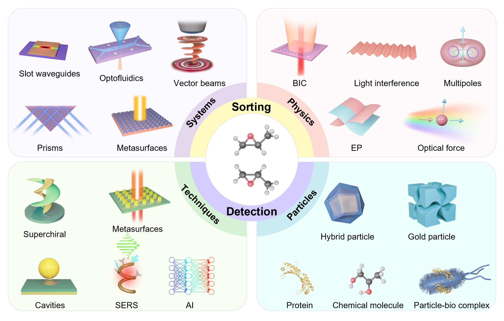 手性是自然界中普遍存在的一类几何与物理属性,在食品安全、药物研发、临床诊断和材料科学等领域具有重要应用价值。尽管一对手性异构体在化学组成上完全相同,但其空间构型的微小差异却可能导致截然不同的生物活性与药理效应。因此,如何对手性分子进行高灵敏、非破坏性的分选与检测,始终是化学、生命科学和材料科学领域面临的核心挑战。传统的手性分析方法主要依赖化学衍生、生化反应或色谱分离等非光学手段。这类方法虽然技术体系较为成熟,但通常存在操作流程复杂、样品消耗大、实时性不足等局限。相比之下,基于光与物质相互作用的光学方法具有非接触、非破坏和易于集成等优势,正逐步成为手性研究领域的重要发展方向。