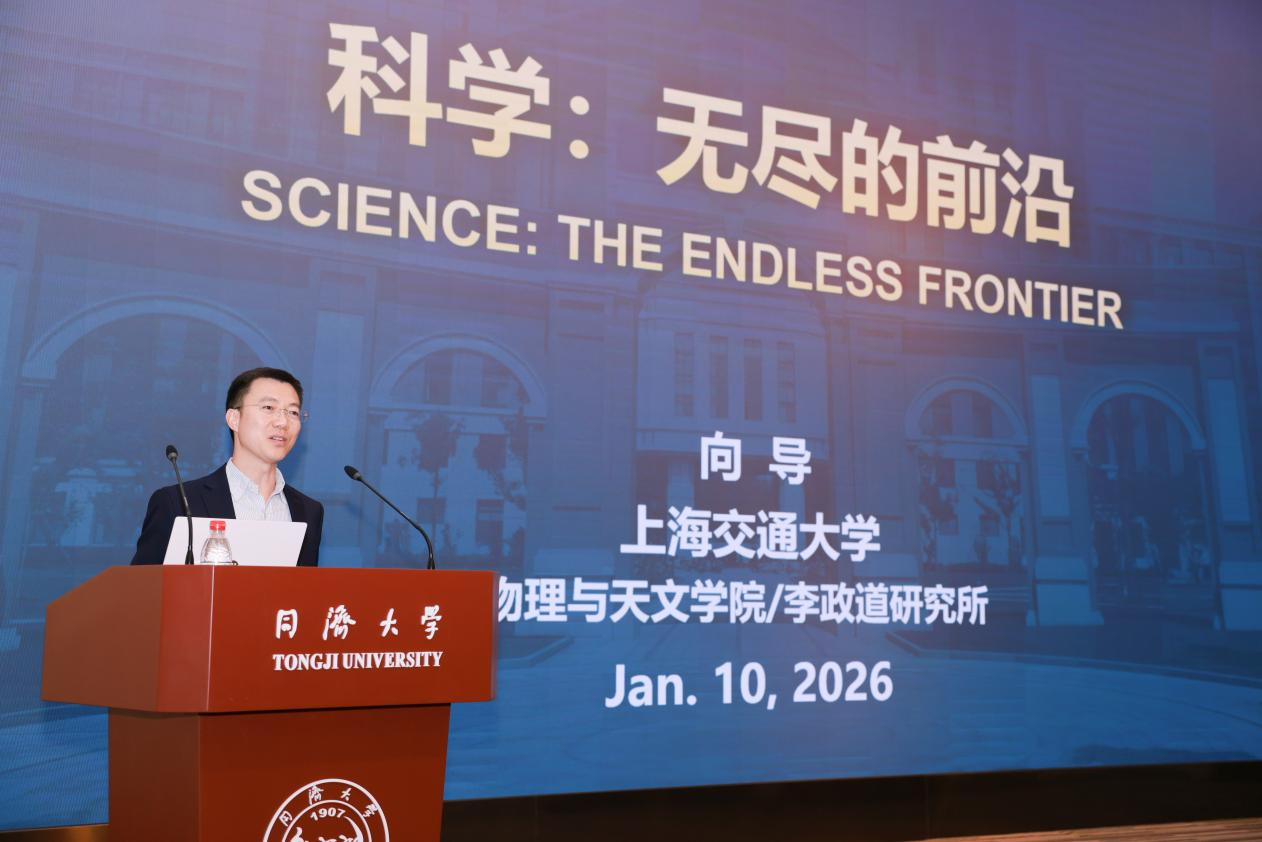开幕式后,上海交通大学物理与天文学院向导院长带来了特邀学术励志讲座。他以《科学:无尽的前沿》为题,在“上天、入地、下海”的立体维度中,勾勒出科学前沿的壮阔图景。其内容从承载人类文明密码的旅行者一号金唱片,到描绘太空探索轨迹的环日计划与Insight探测器;从体现国家科技基建实力的锦屏深地实验室升级,到印证科研与国力同步跃升的“海铃计划”硬核科技支撑,横跨多个尖端领域。他更以“愿第四次科技革命始于中国”的展望激励在场学子,并以“志存高远、脚踏实地”的嘱托点燃青年的科创理想。