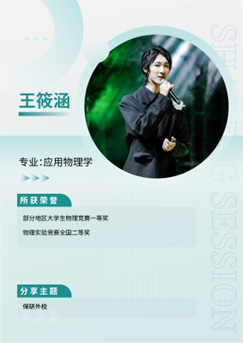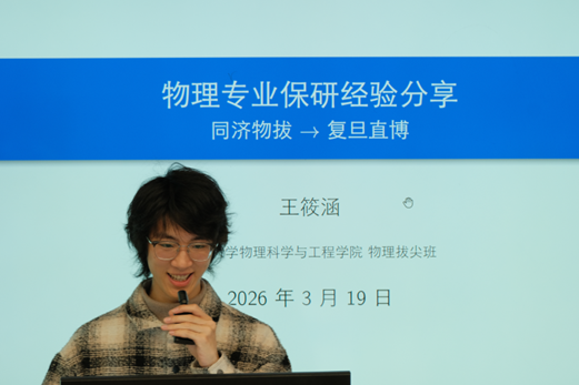 随后,王筱涵同学结合自身经历,分享了校外保研特别是保研至复旦大学的经验。他坦言,自己最初同样经历过迷茫和焦虑,不知道该选择哪个方向、联系哪位导师。真正推动他明确方向的,是一次认真准备课程汇报和前沿讨论班报告的经历。在深入阅读文献、完成展示后,他逐渐意识到自己对非厄米物理方向真正产生了兴趣,并据此开始有针对性地联系导师。