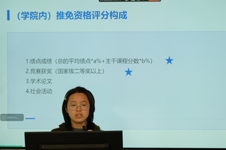 汪昕悦同学从本校保研的角度出发,介绍了推免资格的构成、整体流程以及专项计划的基本情况。