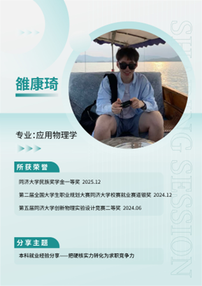 最后,雒康琦同学围绕本科就业进行了分享。他目前的就业去向为上海相关企业的融资租赁岗位。他首先回应了不少同学关于“物理本科是不是只能做教培”的疑问,并明确表示:本科就业的选择并不狭窄,关键在于是否敢于打开视野、主动探索。