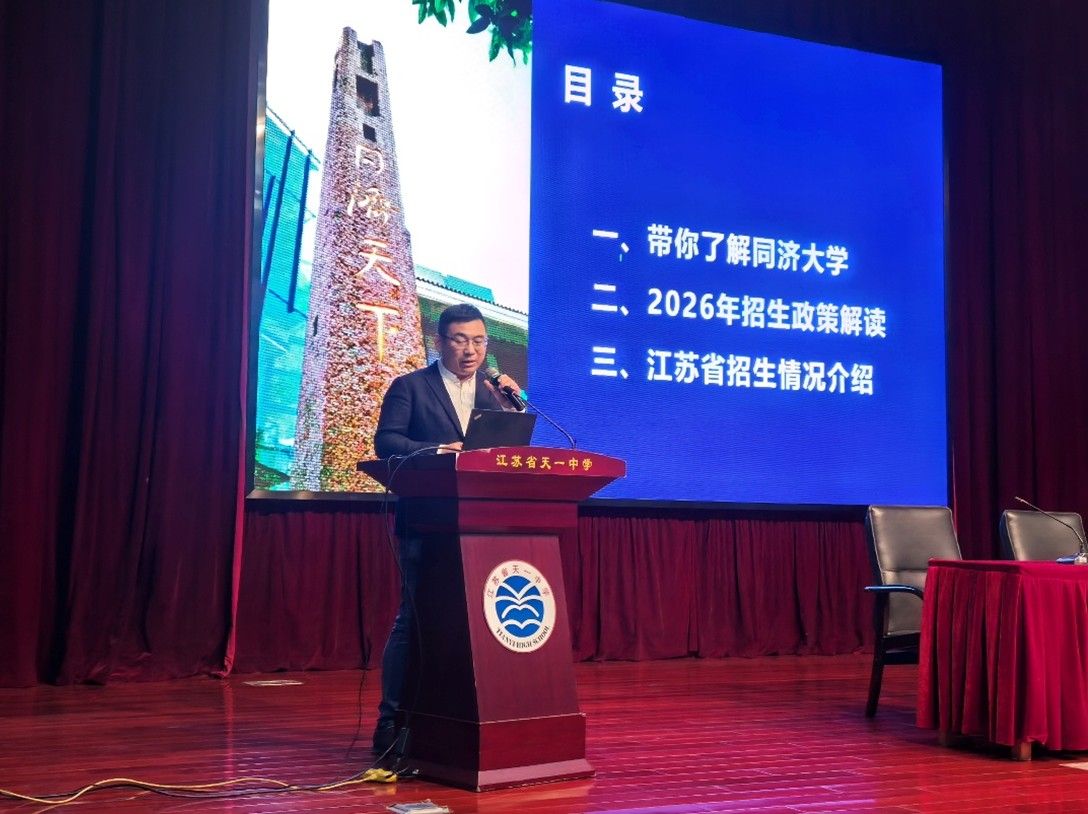 许学军为天一中学200余名优秀学子作《感受数学之美》主题报告,以案例讲解展示数学学科的多元分类与广泛应用,并介绍同济大学数学学科发展基础与人才培养成果。张建卫围绕同济大学办学特色、2026年招生政策及江苏省招生情况作宣讲,帮助师生进一步了解学校育人理念与招生信息。